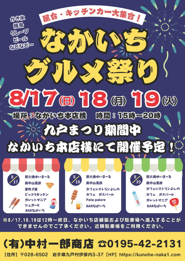 例年、九戸祭りに併せて開催している「なかいちグルメ祭り」ですが、皆さまのご愛顧に感謝して今年も開催することといたしました~!