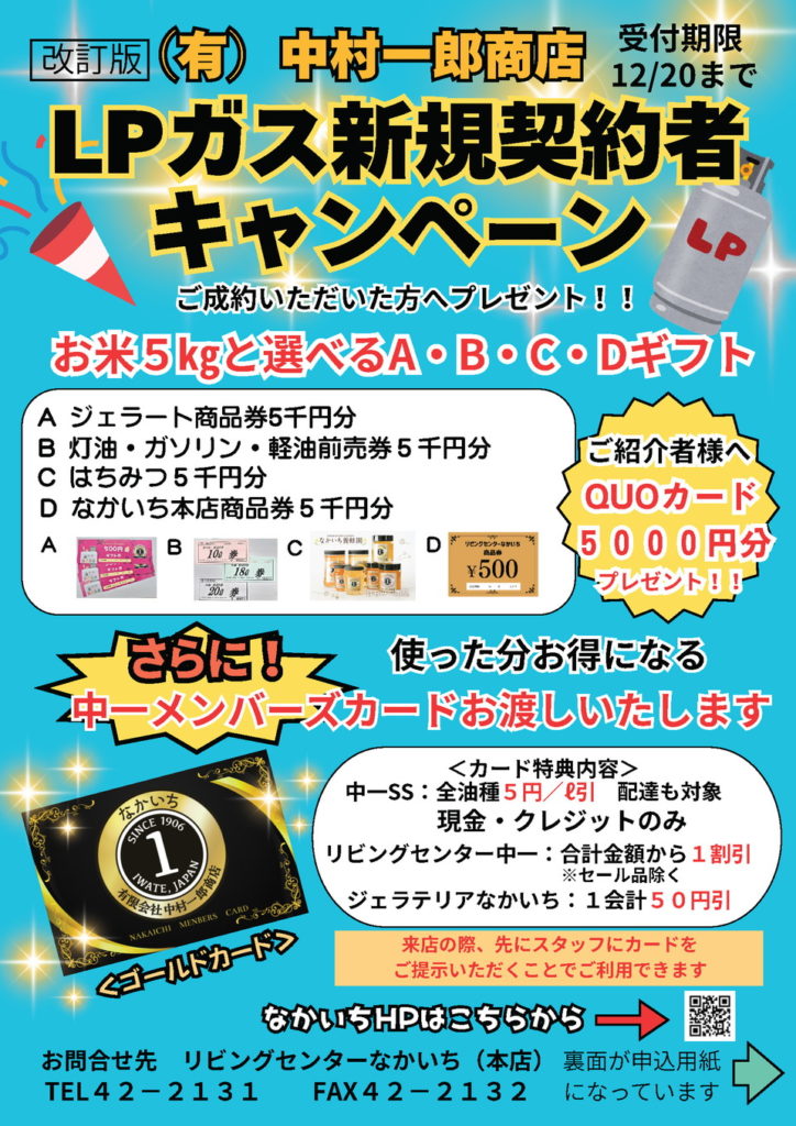 なかいちではこの度、LPガスの新規契約者すべての方に、【お米と選べる商品券が受け取れるキャンペーン】を開始いたします!